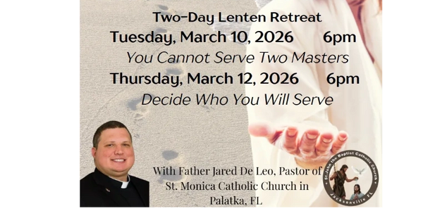 Join Father Jared De Leo, Pastor of St. Monica's Catholic Church in Palatka for a two-day Lenten Retreat called "Choose this Day" on March 10th and March 12th at 6:00PM.